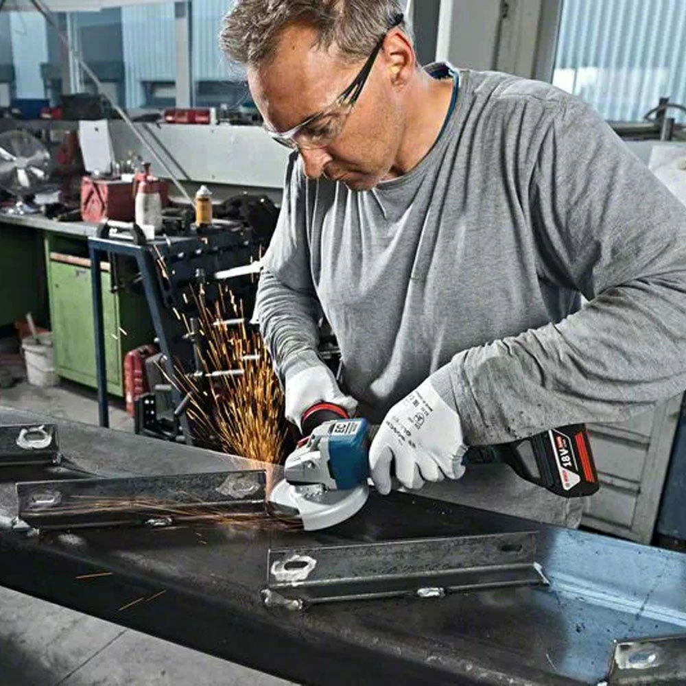 The GWS 18V-10 PC Professional cordless small angle grinder offers an improved level of power and tool control in the 18 V category. It delivers power equal to a 1,000 W corded grinder due to its brushless motor and ProCORE18V battery technology. Equipped with KickBack Control and an intelligent brake system, this small angle grinder offers an increased level of user protection and convenience. It also features a PROtection switch that instantly turns the grinder off when it is released, further maximizing user protection. This tool is intended for cutting and grinding metal, stone, and concrete. It is compatible with dust attachments GDE 125 EA-T Professional and GDE 115 / 125 FC-T Professional, and Bluetooth module GCY 30-4, as well as all Bosch Professional 18 V batteries and chargers (Professional 18V System).