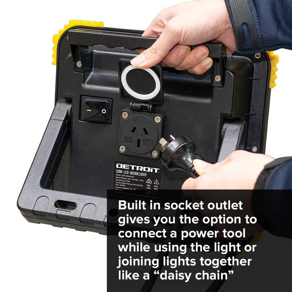 The DETROIT 4000 Lumen LED Worklight has a 240V outlet in the back which allows you to connect multiple lights together or power another small electrical device like a radio or power tool.