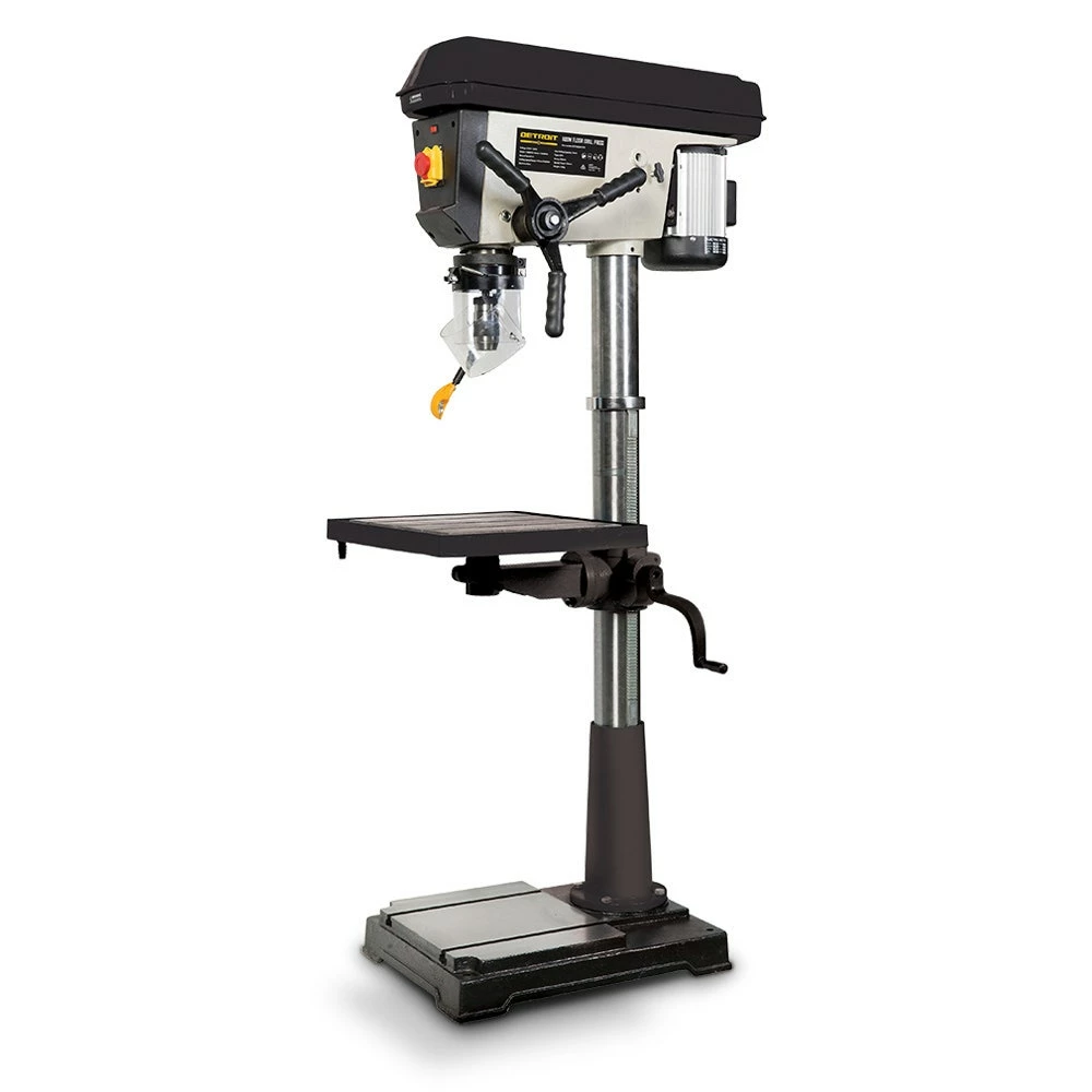 Improve your drilling bit by bit with a Detroit Masters Drill Press. This quiet, efficient and dependable drill press is manufactured to the highest standard. The 12-speed pulley drive is powered by an induction motor, which allows precision drilling in most workshop applications including angled and low-speed drilling (required for larger holes). A keyless chuck, a large work table with t-slots, LED worklight, and a heavy-duty handle are just some of the features that make this drill ideal for a professional industrial workshop.