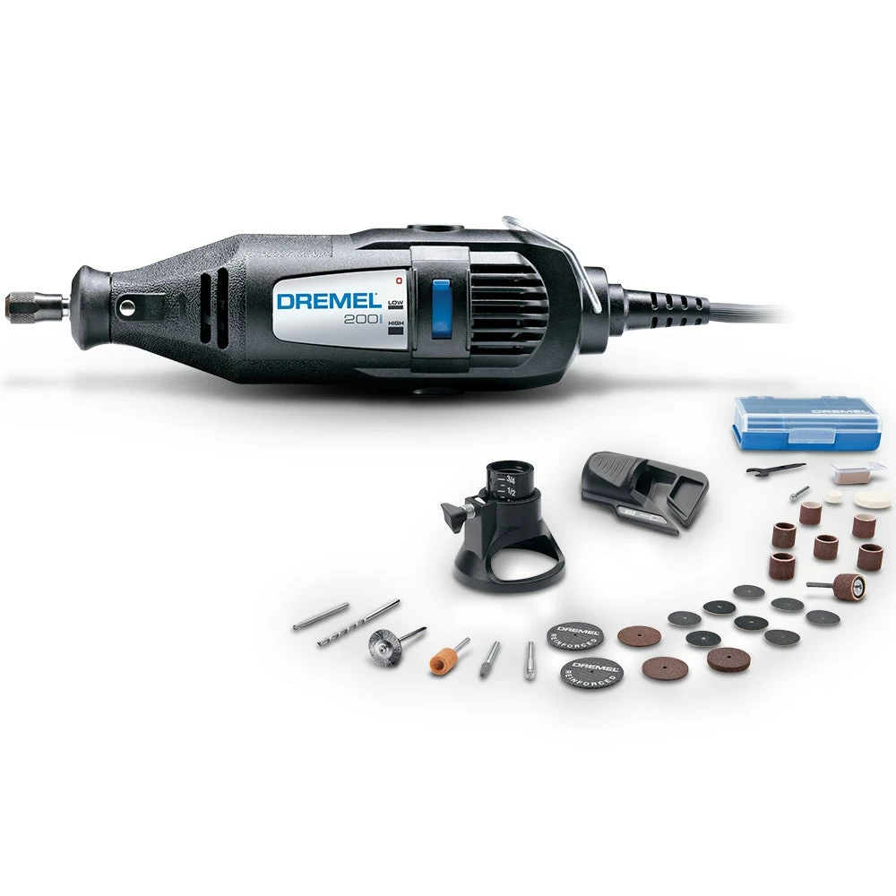 The Dremel 200 Series rotary tool offers the precision and control required to complete a wide range of projects. Its two speed settings allow you to use the low speed setting for cleaning applications and using brush accessories and the high speed setting for routing, cutting and sanding applications. Two year warranty.