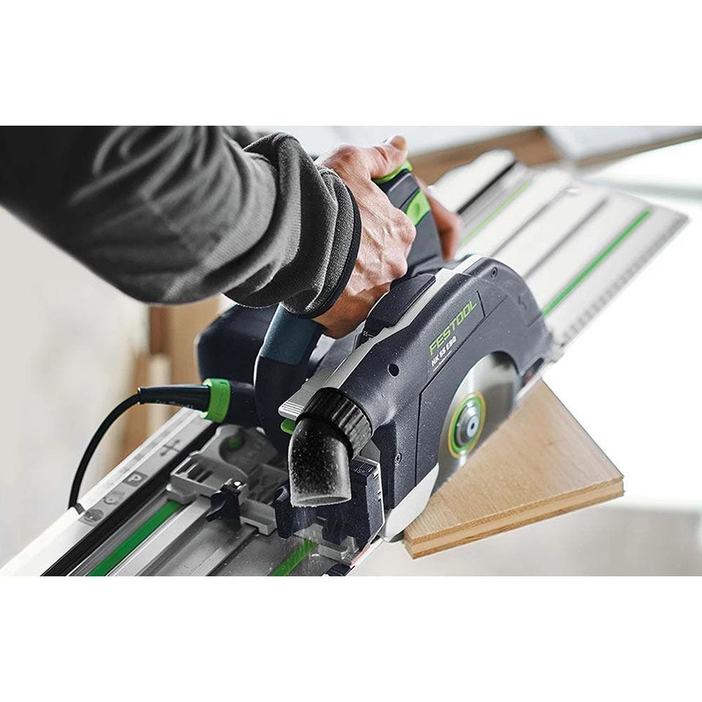 The HK 55 portable circular saw in combination with the FSK cross-cutting guide rail. The new mitre-saw system for more independence combines precision and efficiency with a high level of user-friendliness, optimised ergonomics, and ease of use. Features such as the cutting depth adjustment with plunge cut function, pendulum hood remote control, guide wedge, and FastFix saw blade change, for example, provide the best possible working conditions. And the FSK cross-cutting guide rail produces precise cuts with repeat accuracy.