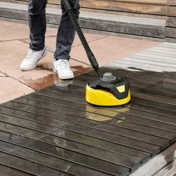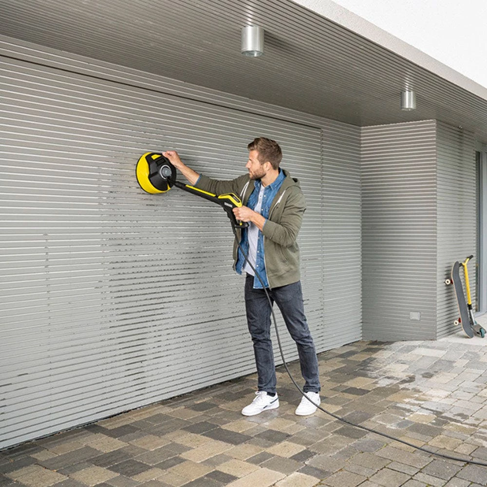 The twin-jet rotating arm of the T 5 T-Racer surface cleaner is capable of removing dirt over large areas, providing fast and efficient cleaning of large outside areas. The surface cleaner can be adjusted so that the nozzle is positioned at the ideal distance from the surface, depending on the material, making it ultra-practical for use. This means that hard surfaces, such as stone and concrete, can be cleaned just as effectively as more delicate surfaces, such as wood. The T 5 T-Racer cleans in around half the time needed by a spray lance. The hood reliably protects the operator and surroundings from spray water, and the “hovercraft effect” makes manoeuvring simpler than ever. Simply remove the extension poles and use the handles for comfortable use when cleaning vertical surfaces such as walls and facades. Suitable for pressure washer ranges K 2 to K 7.
