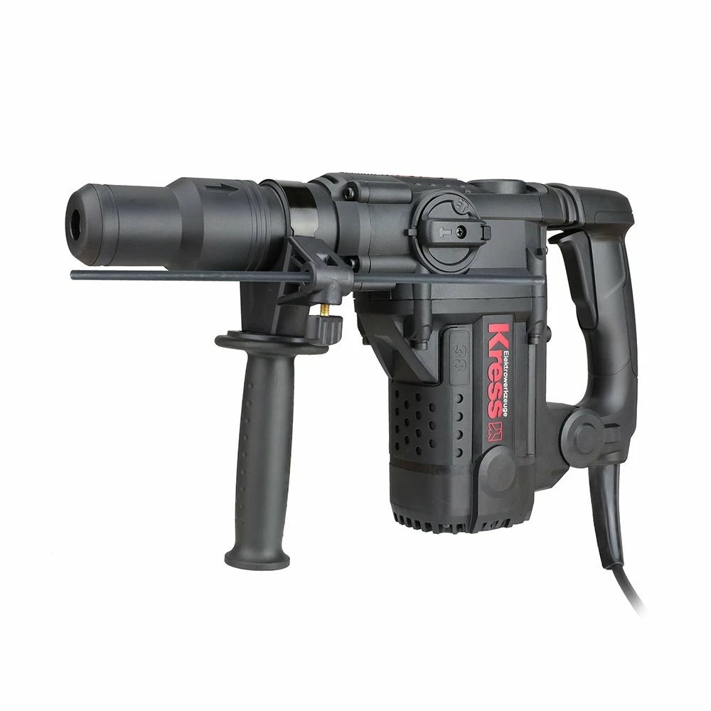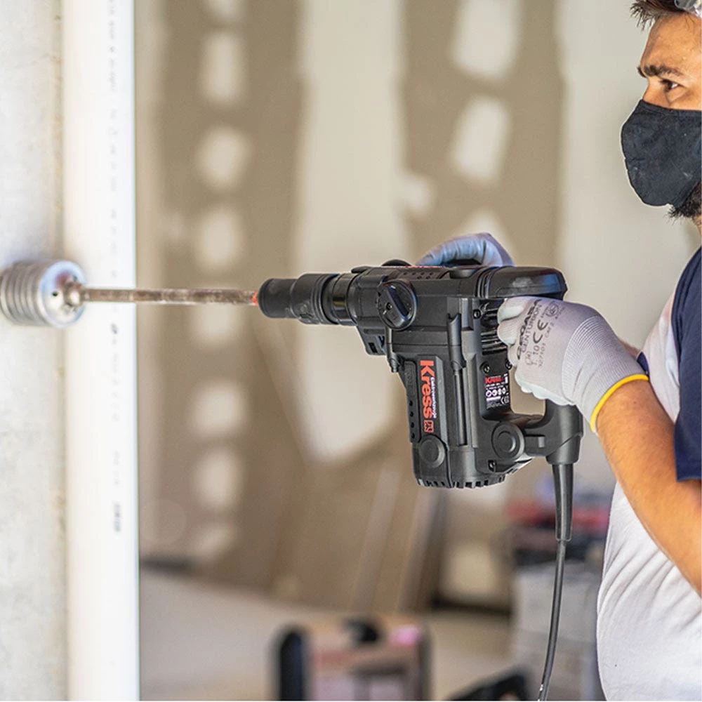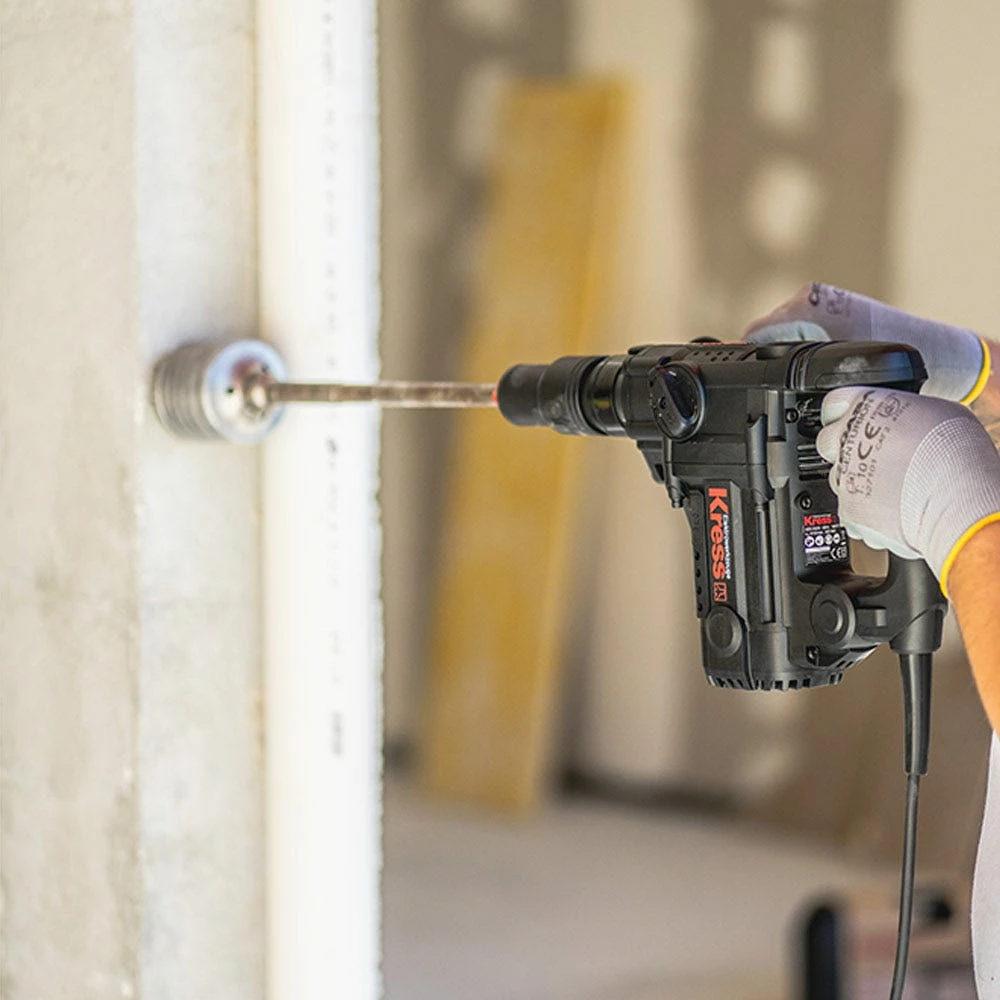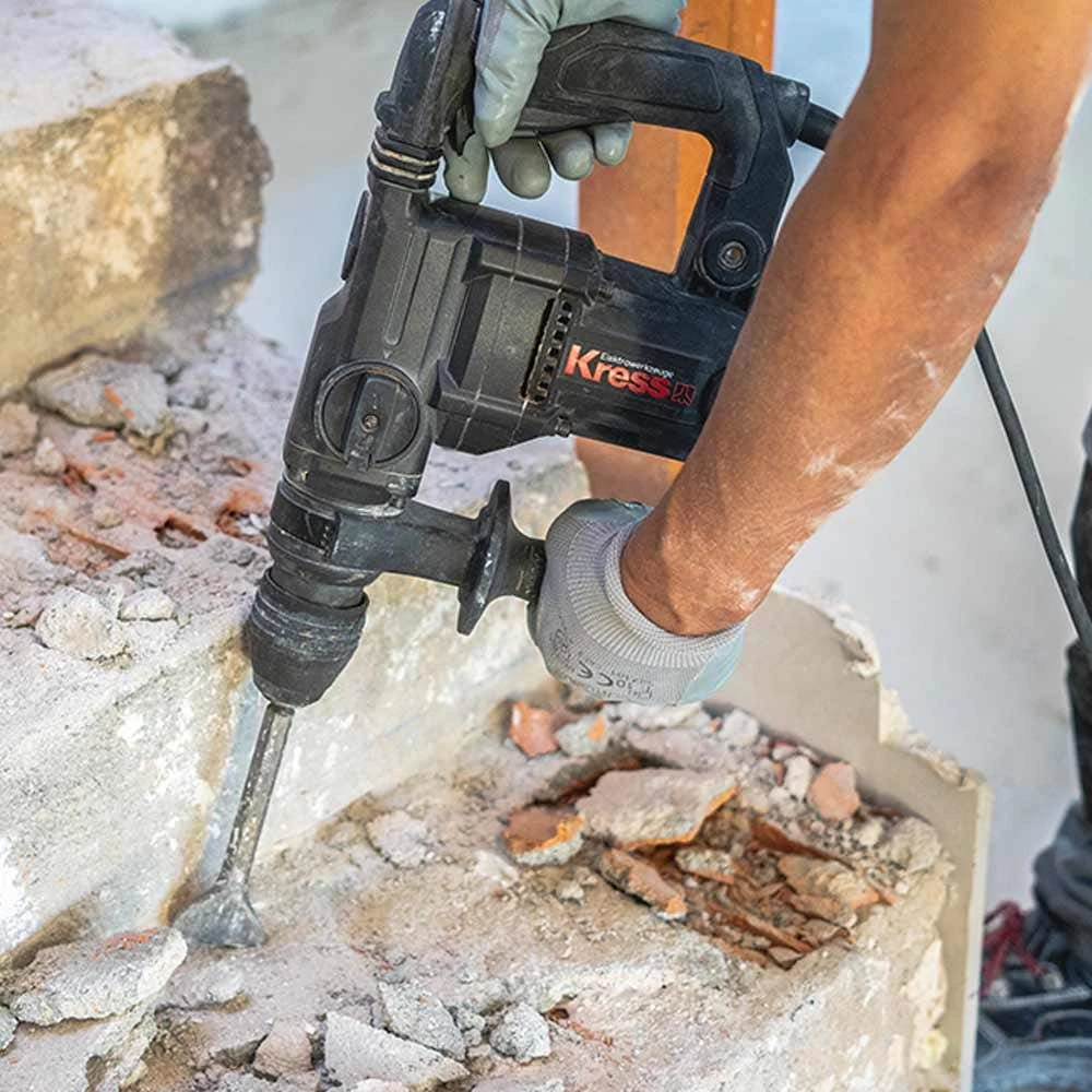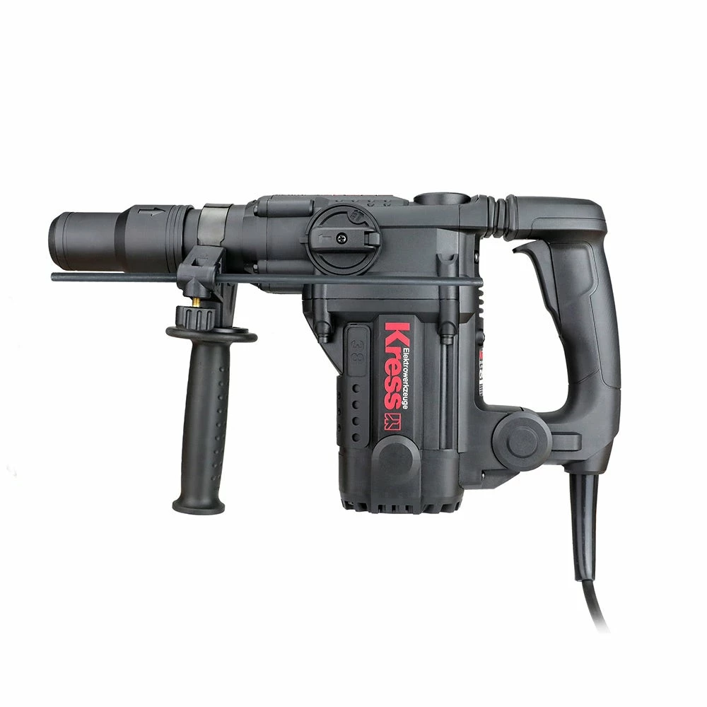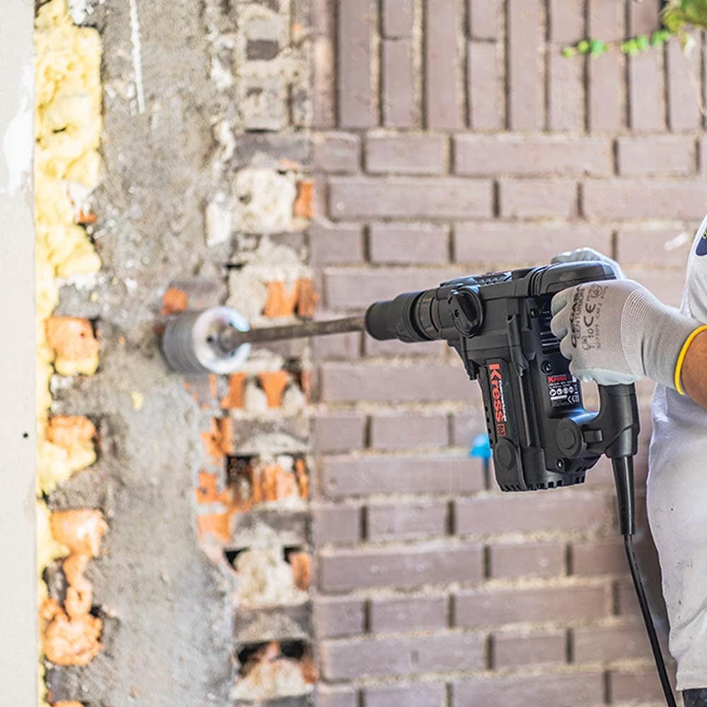The KRESS 1050W SDS Plus 38mm Rotary Hammer delivers a powerful 7.5J of impact energy, 4150 BPMS of high speed drilling power into diameters up to 38mm for maximum material removal. It offers the versatility of 2 Functions; Hammer drilling and chiseling, and rotary stop, as well as an SDS Plus chuck for easy bit changing. Anti-vibration technology combined with an ergonomic design offers overall improved comfort and control. It features overload protection to protect the motor from excessive heating. Includes 1 x auxiliary handle, 1 x depth gauge, and a sturdy carry case for storage and transport.