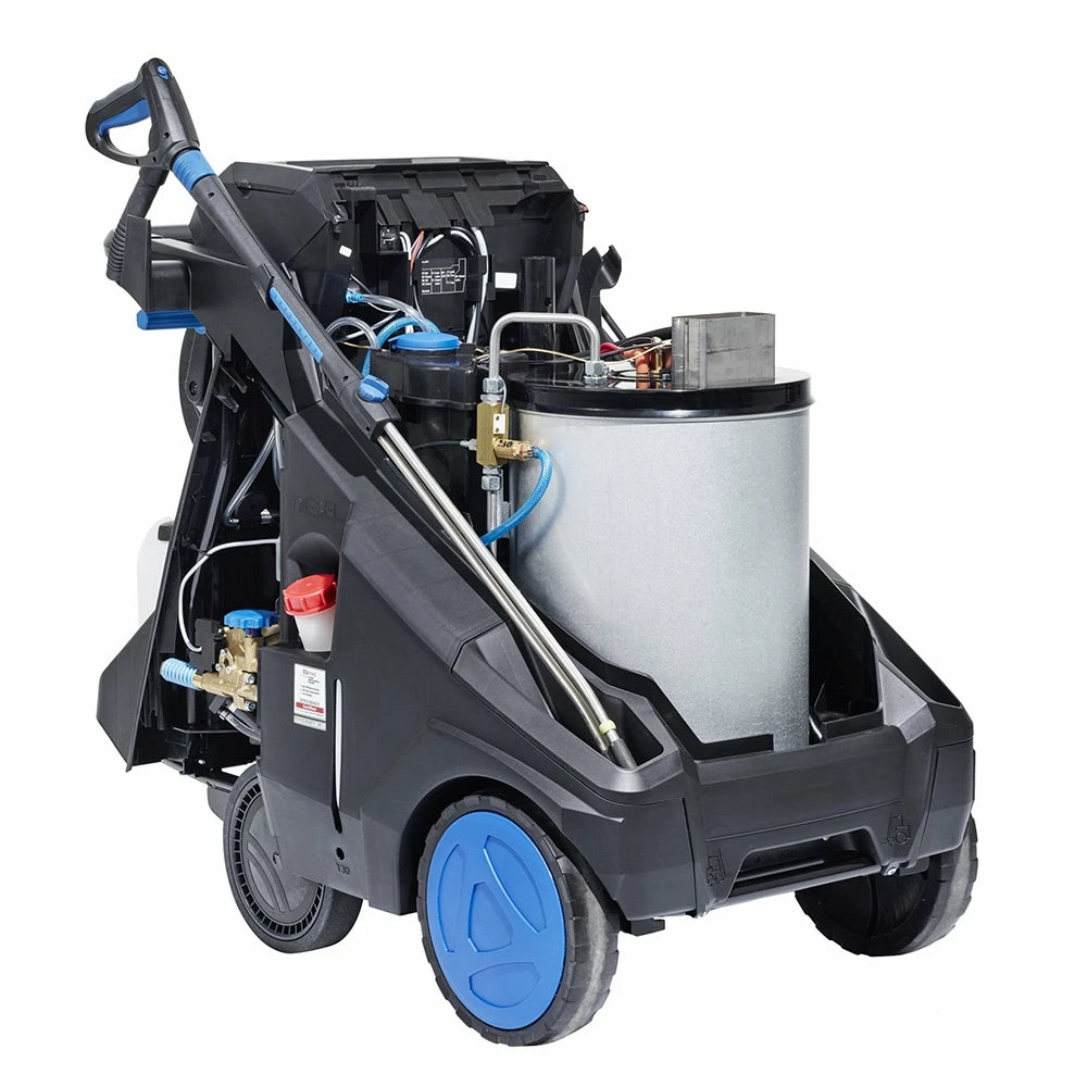 The versatile MH 5M combines low running costs, high performance, ease of use, best in class mobility and great cleaning efficiency. The innovative design makes it easy to move over all types of surfaces. The flow-activated control system contributes to even more comfortable use of the machine and assures durability and reliability. The EcoPower boiler system offers > 92% efficiency for significantly reduced fuel consumption and lower running costs.